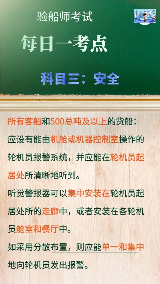 注册验船师科目三考试考点学习 注册验船师科目三考试考点学习轮机员报警系统的安装: 所有客船和500总吨及以上的货船:应设有能由机舱或机器控制室操作的轮机员报警系统,并应能在轮机员起居处所清晰地听到。听觉警报器可以集中安装在轮机员起居处所的走廊中,或者安装在各轮机员舱室和餐厅中。 如采用分散布置,则应能单一和集中地向轮机员发出报警。更多验船师考试资料,请点击【下载原文】 版权声明:转载请注明出处:https://www.yanchuan88.cn/news_15/19091.html